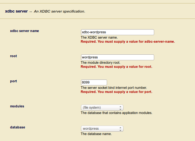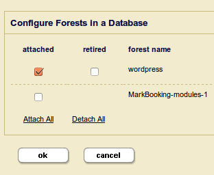 Prior to importing the post we obviously need a database to store them. In addition to that mlcp makes use of a XDBC (XML Database Connector) service to import the data. We will use the port of this service as a crucial import for mlcp. Create a database by going to the admin console (port: 8001). Under Database you’ll find a Create tile to add a new database. For now we’ll just give it a name, for example wordpress, and leave the other settings defaults. After you have created the database you’ll need to assign a so called Forest to it. A Forest is the index structure to each document in the database and is required to make the documents search able. The name is probably related to the fact that it treats all documents as root and many roots are a forest, aren’t they?