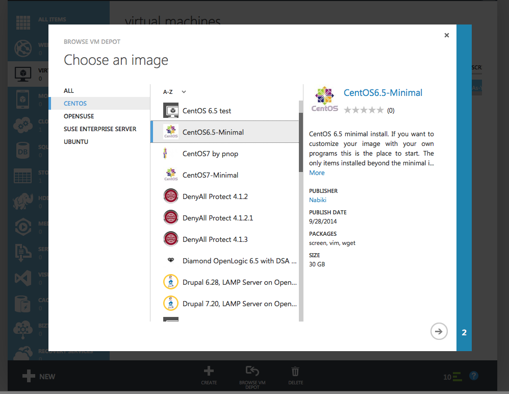 First I imported a CentOS image I found in the VM Depot using the Azure management console.