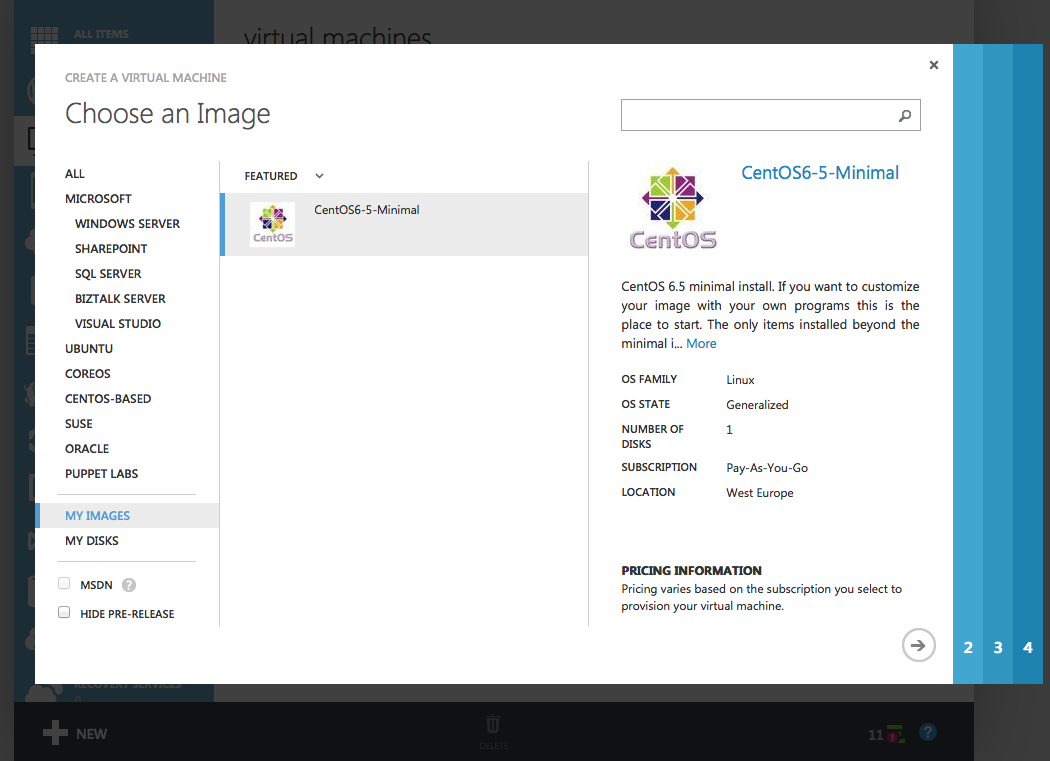 Once the image has been successfully imported it can be used to launch a new instance. Create a new virtual machine by selecting the image from your gallery. Use “From Gallery” to be able to select an image from “My Images” as you can see below. Create the virtual machine like any other.
