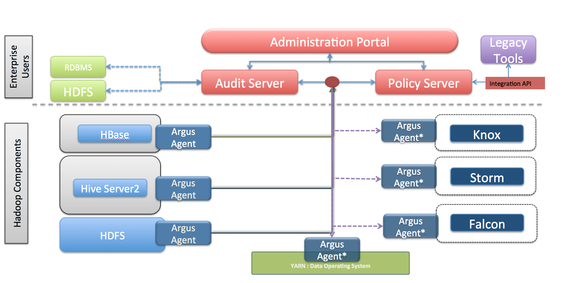 Argus a Comphrensive ApproachArgus consists of four major components that tied together build a secure layer around your Hadoop installation. Within Argus it is the Administration Portal, a web application, that is capable of managing and accessing the Audit Server and Policy Manager, also two important components of Apache Argus. At the client side or a the Hadoop services like the HiveServer2 or the NameNode Argus installs specific agents that encapsulate requests based on the policies specified.
